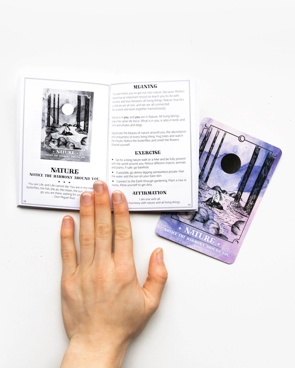 Every illustration was created intuitively and has symbolisms and deeper meanings related to the card. Mountains often symbolise challenges, water symbolises going with the flow, specific flowers and animals illustrated have their own associated meanings. Celestial elements in the artworks such as stars, planets and moons represent our connection with the Universe.
