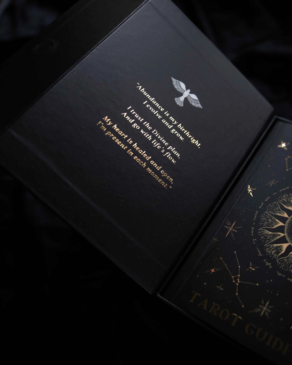 Paired with a 100-page detailed guidebook, this dreamy deck is an invitation to dive into your subconscious, explore your own magic and connect with the Universe that is inside and outside of you. infused with love... The cards have been infused with a special prayer, written in cursive around the Sun on the backside: “Abundance is my birthright, I evolve and grow. I trust the Divine plan, And go with life’s flow. My heart is healed and open, I’m present in each moment.”
