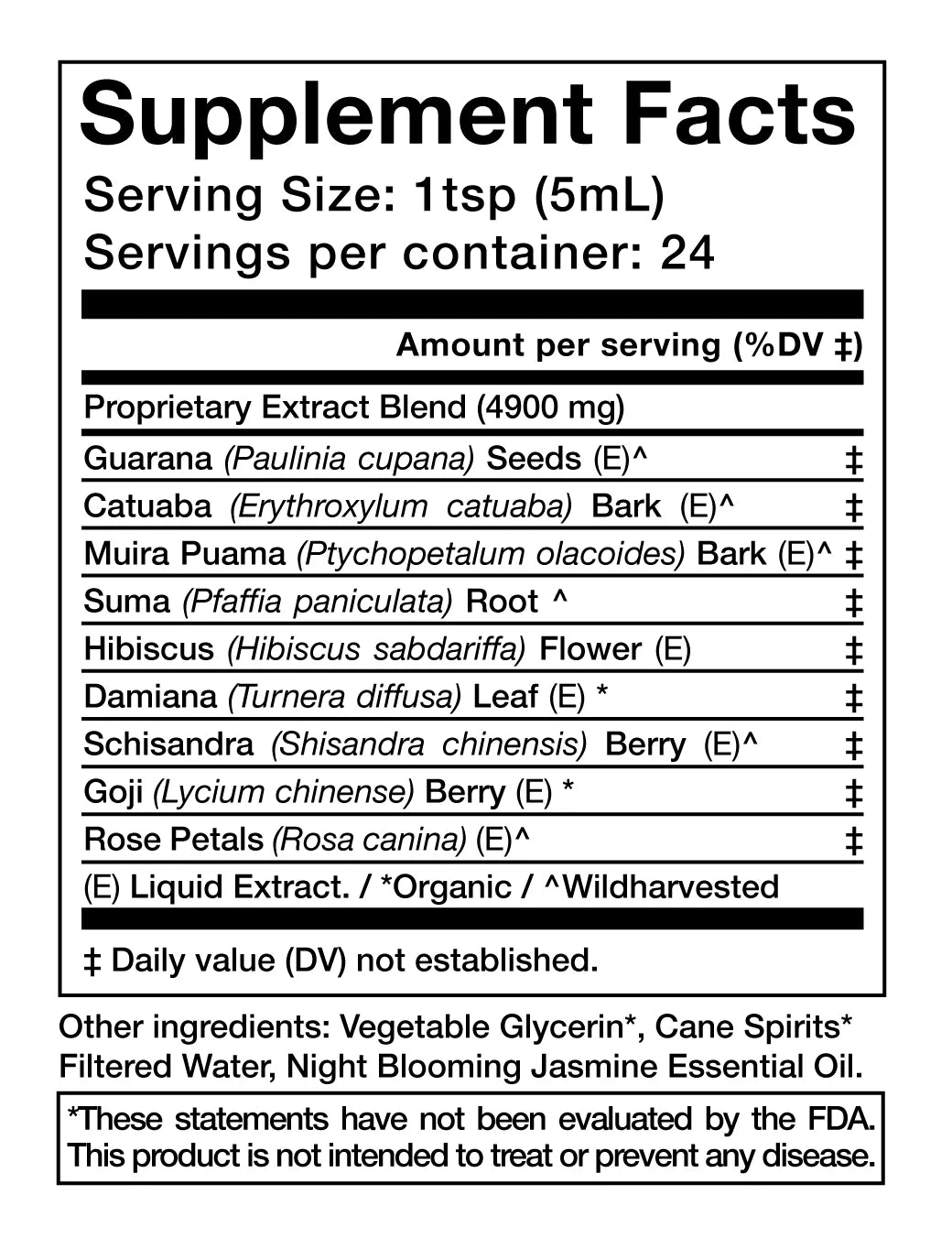 INGREDIENTS Guarana (Paulina cupana) Seeds (E)^, Catuaba (Erythroxylum catuaba) Bark (E)^, Muira Puama (Ptychopetalum olacoides) Bark (E)^, Suma (Pfaffia paniculata) Root^, Hibiscus (Hibiscus sabdariffa) Flower (E), Damiana (Turnera diffusa) Leaf (E)*, Schisandra (Schisandra chinensis) Berry (E)^, Goji (Lycium chinense) Berry (E)*, Rose (Rosa canina) Petals (E)^ *Organic / ^Wildcrafted / (E) Liquid Extract Other ingredients: Vegetable Glycerin*, Cane Spirits*, Filtered Water, Night Blooming Jasmine Essential Oil