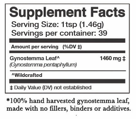 INGREDIENTS Gynostemma (Gynostemma pentaphyllum) Leaf^ ^Wildcrafted Wild grown in Yunnan, China SERVING SUGGESTION 2oz / 57g Serving Size: 1 tsp (1.46g) Servings per Container: 39 SOURCING ^Wildcrafted Wild grown in Yunnan, China