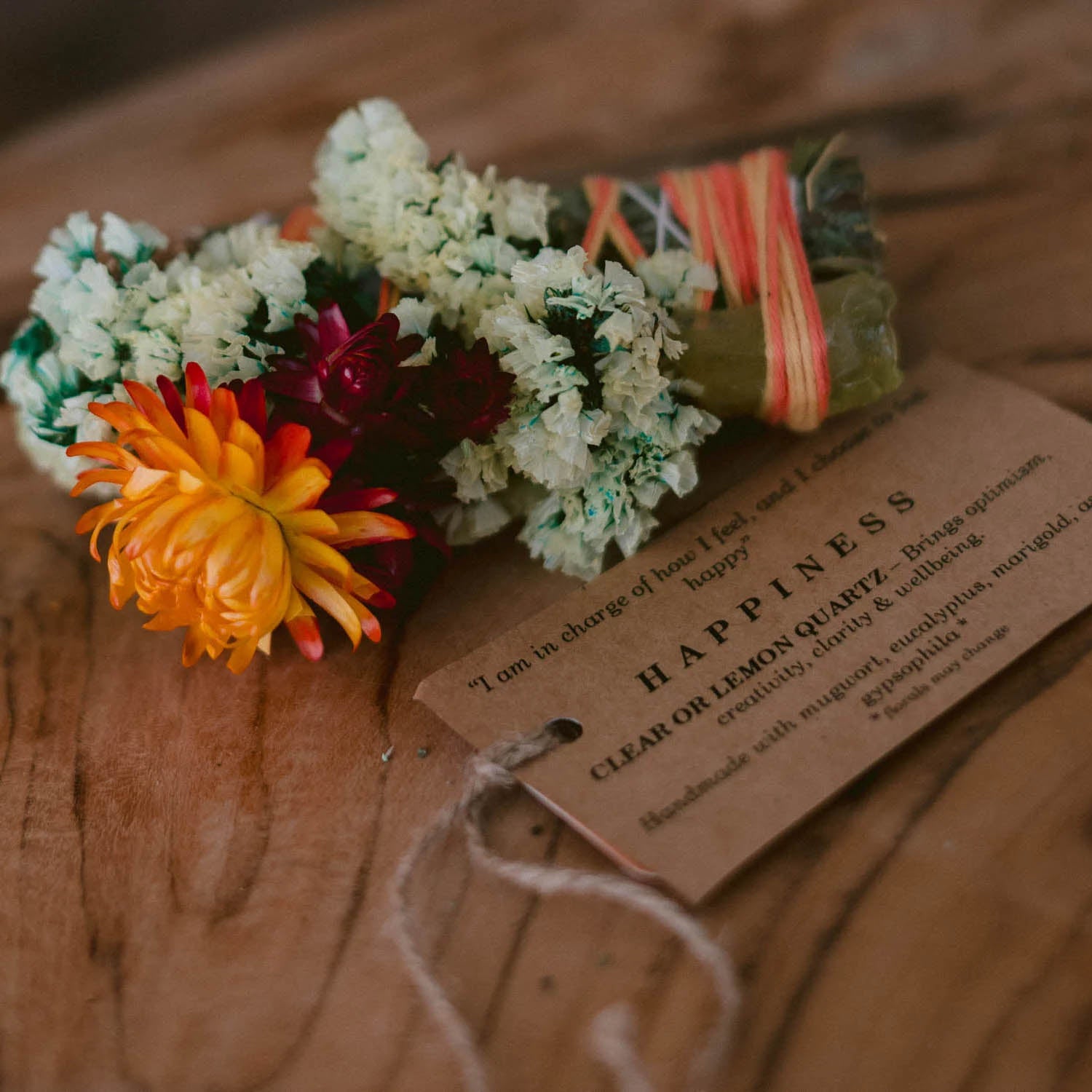 Hand wrapped herbal wand of mugwort, and dried flowers, infused with the crystal energy of raw Lemon Quartz or Clear Quartz for powerful intention setting. A powerful addition to your daily rituals.