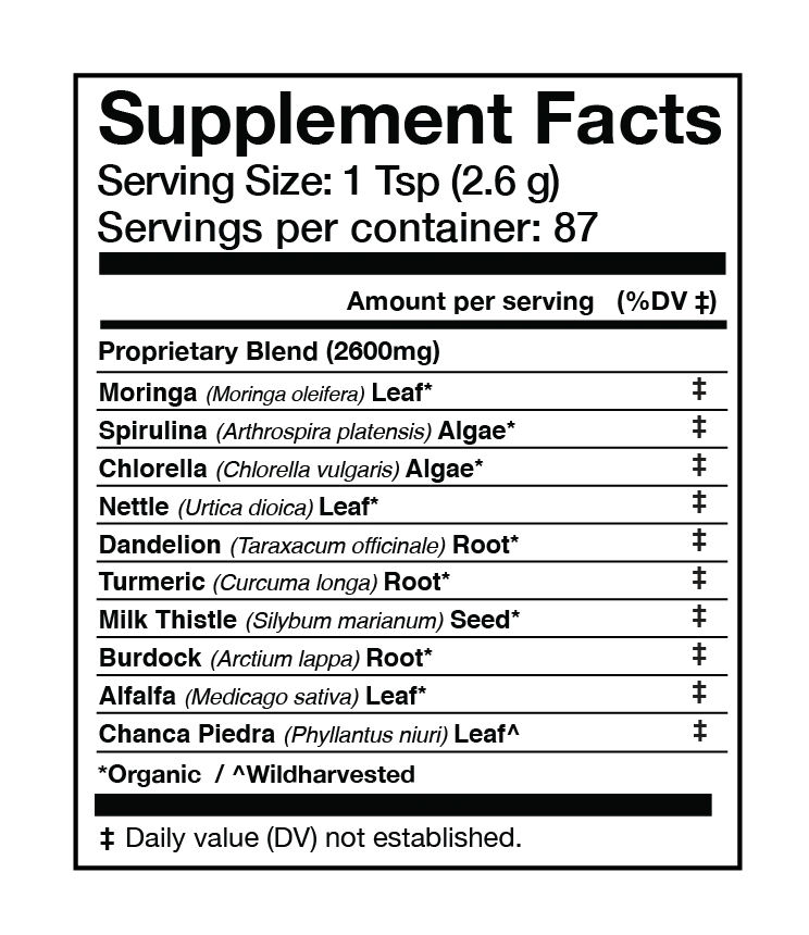 A superfood with the power to cleanse the liver, harmonize digestion and support the gastrointestinal tract. This cleansing powder is formulated with traditional herbs, roots, algae and seeds known to greatly assist the microbiome: using key herbal prebiotics, such as Dandelion Root, Burdock Root, Nettle, Milk Thistle and Alfalfa, alongside nutrient rich algae such as Chlorella and Spirulina. Liver Vitality also contains Moringa and Chanca Piedra, two of the most nutrient dense herbs from the jungle.