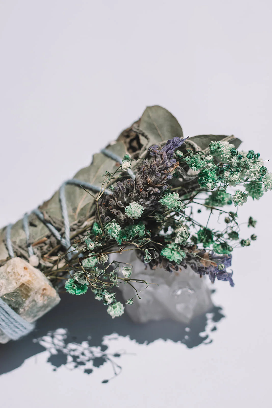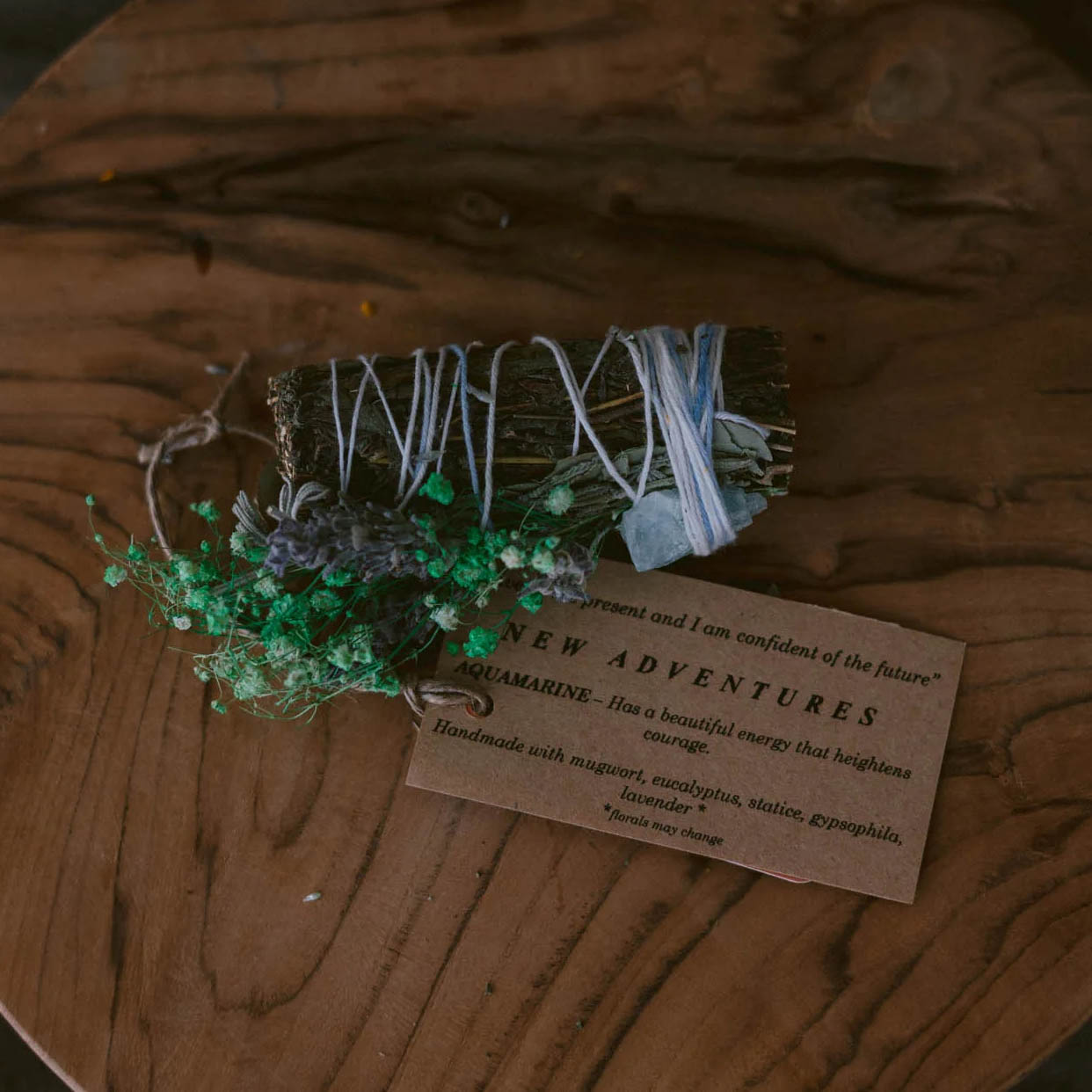 Hand wrapped herbal wand of mugwort, and dried flowers, infused with the crystal energy of Aquamarine for powerful intention setting. A powerful addition to your daily rituals.