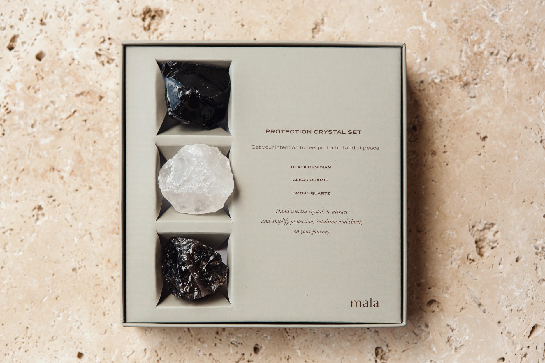 This beautiful gift box contains crystals that provide protection of unwanted negative energy, perfect for those on their healing journey. Protection crystal gift set includes: - black obsidian - clear quartz - smoky quartz Each crystal is intuitively chosen and comes with description cards.