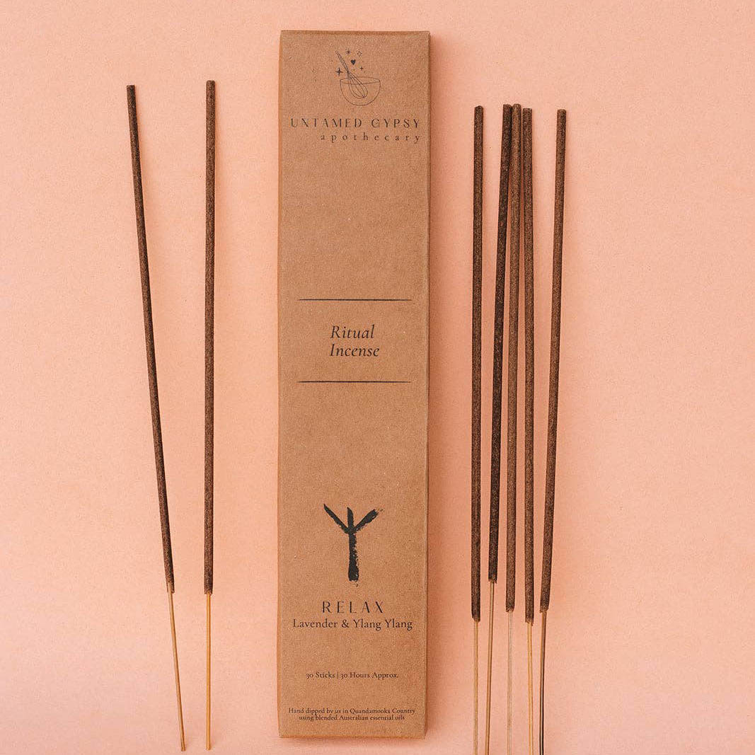Our Relax Incense Sticks provide you with a beautiful aroma that will calm your mind, body, and spirit. Each Incense Stick is hand dipped by us on Quandamooka Country and hosts an essential oil blend of Lavender and Ylang Ylang, a relaxing scent that allows you to truly soothe your soul. How to use: Place incense in a holder and light the tip. Burn for 5 seconds before blowing out the flame. Sit back and enjoy the fragrance as it engages your senses. The ancient ritual of incense can help to - set intention - create positive energy and drive away negative energy - bring you back to yourself Each box contains 30 sticks | Approx. 30 hours burn time Warning: Never leave unattended. Burn over a heat resistant surface. Make sure flame is out and leave to smoulder.