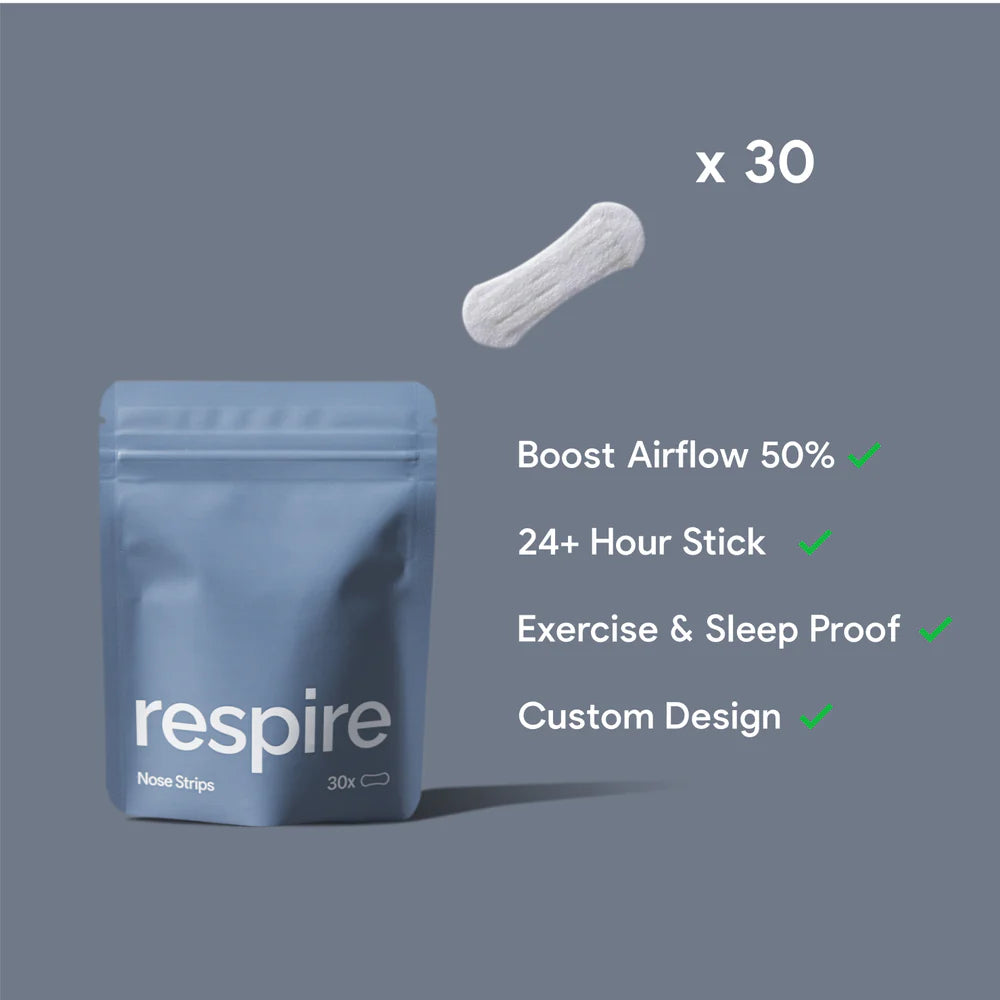 Say goodbye to fatigue, poor sleep, and breathing challenges. Respire Nose Strips instantly optimise your airflow, allowing for up to 30% more oxygen. Experience transformative improvements in your well-being, both day and night.