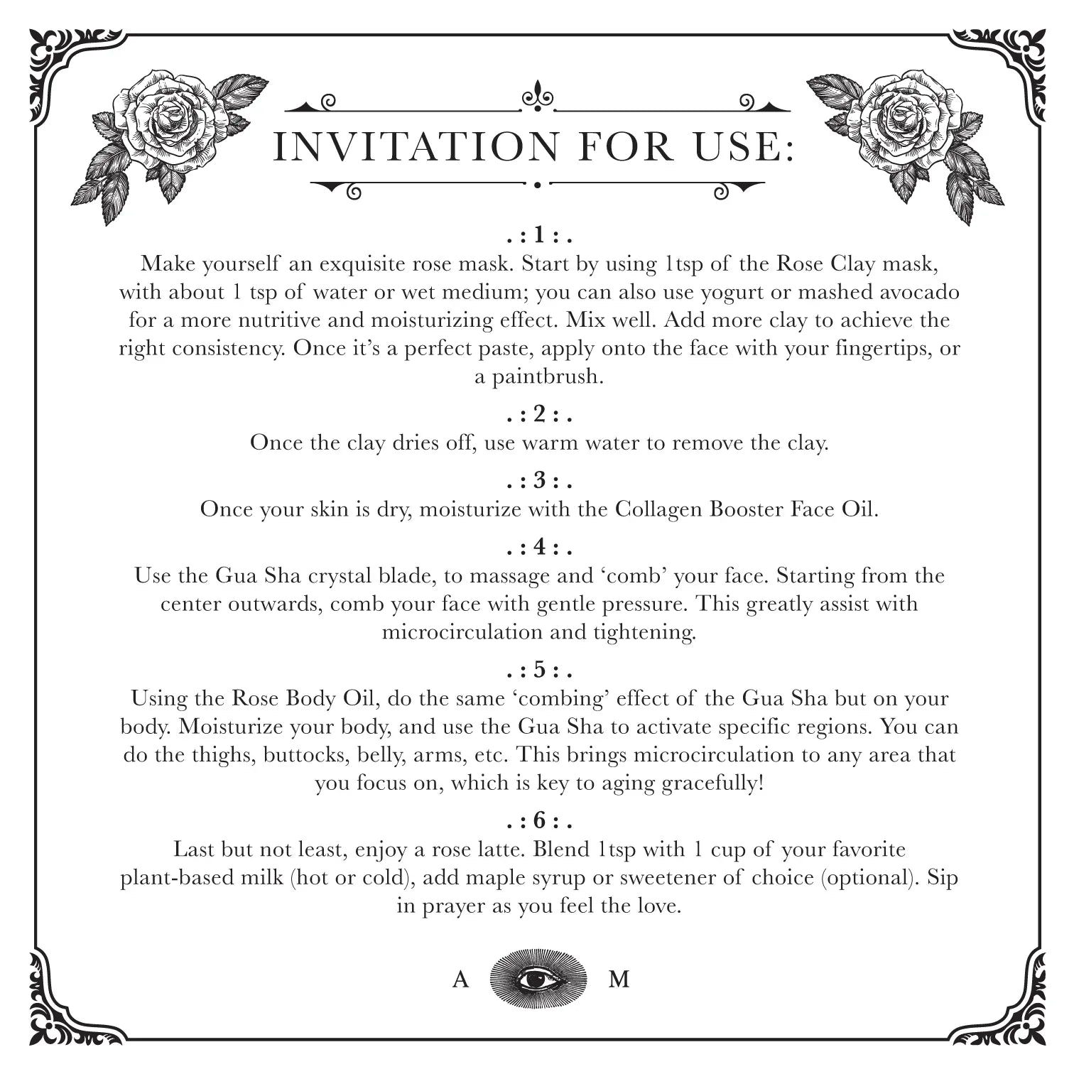 Rose - For thousands of years, many cultures around the world have revered the mind, body and spiritual healing benefits of Rose. Rose is known for relieving the heart, psycho-spiritual related imbalances, and many more. Topically, Rose is very healing for the skin and powerful for reducing inflammation. Our Rose Magic Kit contains a powerful mix of topical oils, our beloved Rose Powder, a gorgeous Rose Face Mask, and a Rose Quartz Gua Sha. Enjoy and behold the power of Rose.