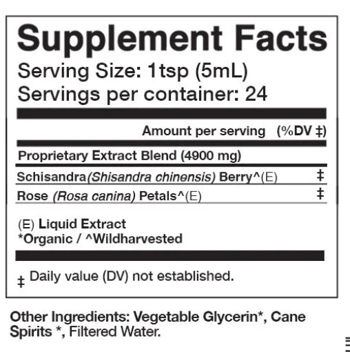 INGREDIENTS Schisandra (Schisandra chinensis) Berry (E)^, Rose (Rosa canina) Petals (E)^ *Organic / ^Wildcrafted / (E) Liquid Extract Other Ingredients: Vegetable Glycerin*, Cane Spirits*, Filtered Water SERVING SUGGESTION Add 1 tsp per serving, 2-3 times per day for optimal results. Enjoy in your beverage of choice. Serving Size: 1 tsp (5mL) 2 fl oz. / 59mL Servings per Container: 12 4 fl oz. / 118mL Servings per Container: 24 16 fl oz. / 473mL Servings per Container: 96 STORAGE Store away from heat and light.